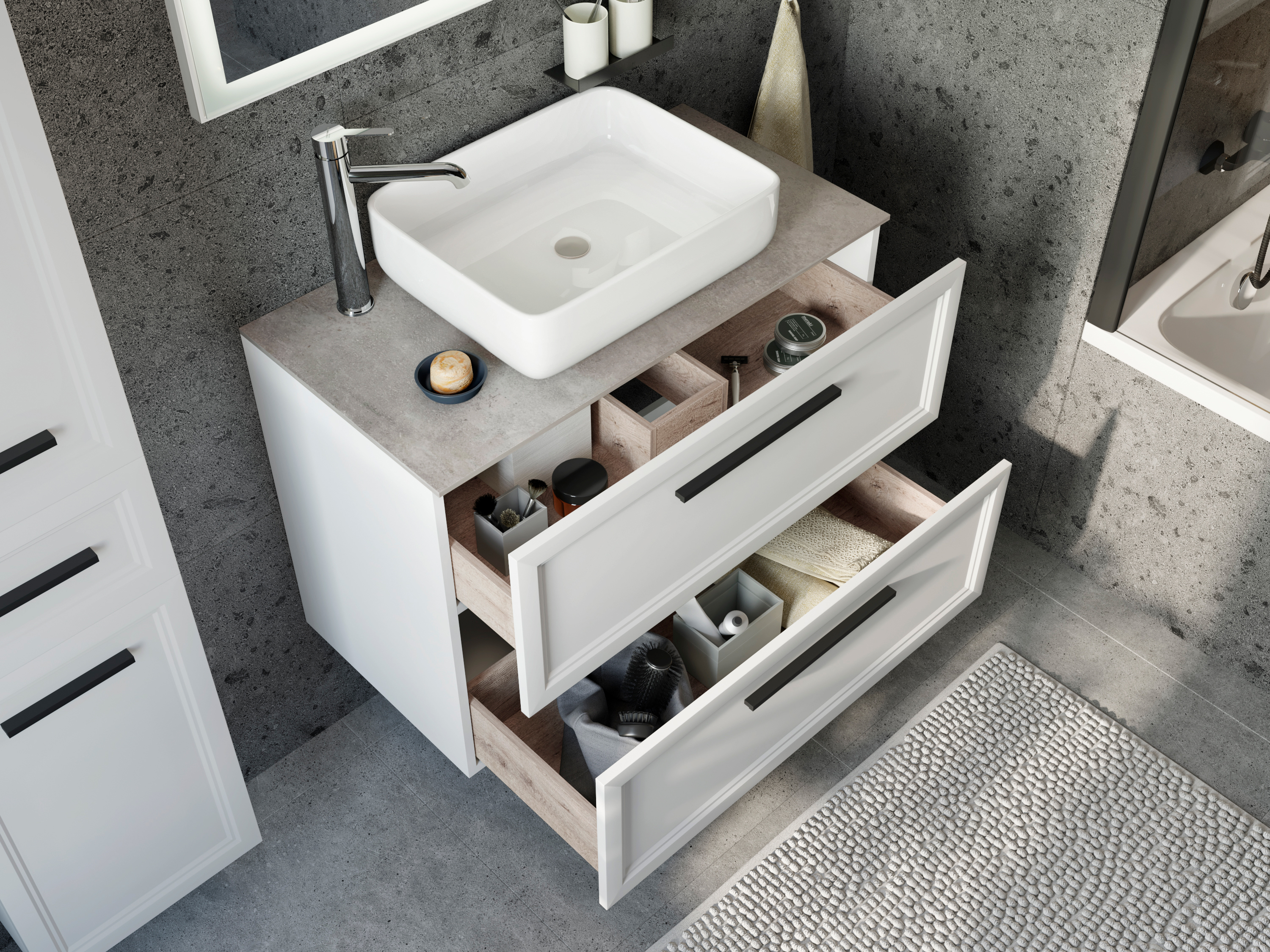 Тумба с раковиной STWORKI Эстерсунд 90 белая матовая, простоун беж с отверстием под смеситель в столешнице