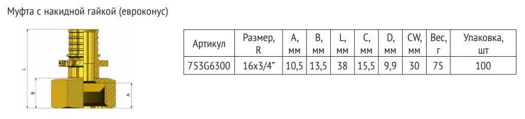 Муфта аксиальная-В 16 x 3/4"ЕК с накидной гайкой