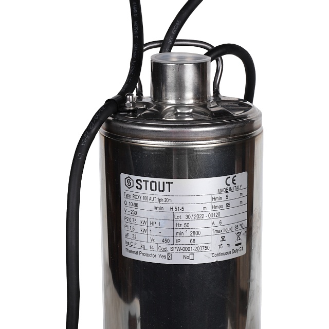 STOUT SPW-0001-200750 Насос колодезный с поплавком, кабель 20 м, 230V, Q=90 л/мин, H=42м