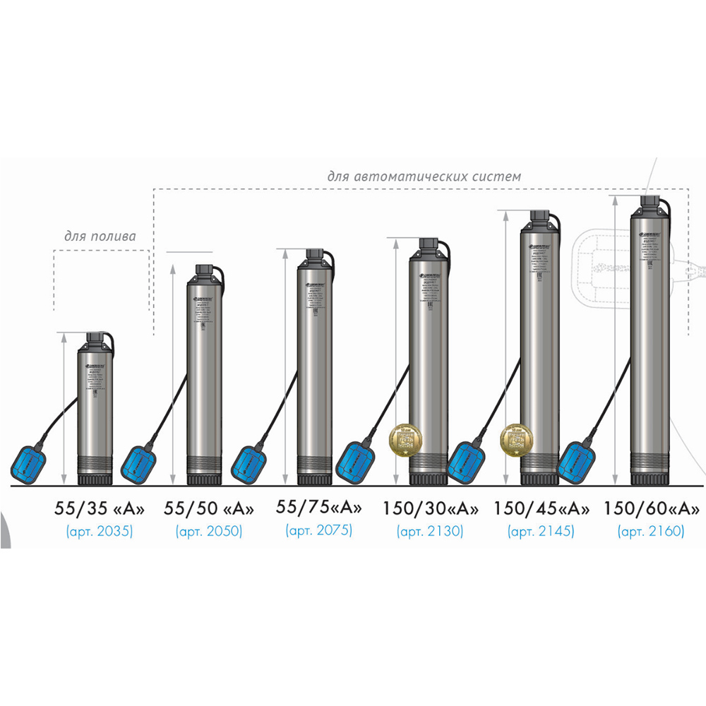 Предназначены для подачи чистой воды из колодцев, резервуаров и открытых водоемов, орошения сада и огорода. Насос автоматически включается и выключается по уровню воды, благодаря тому, что оснащен поплавковым выключателем. Обратите внимание на то, что для комплектации систем полностью автоматизированного водоснабжения дома необходимо доукомплектовать его соответствующими аксессуарами.