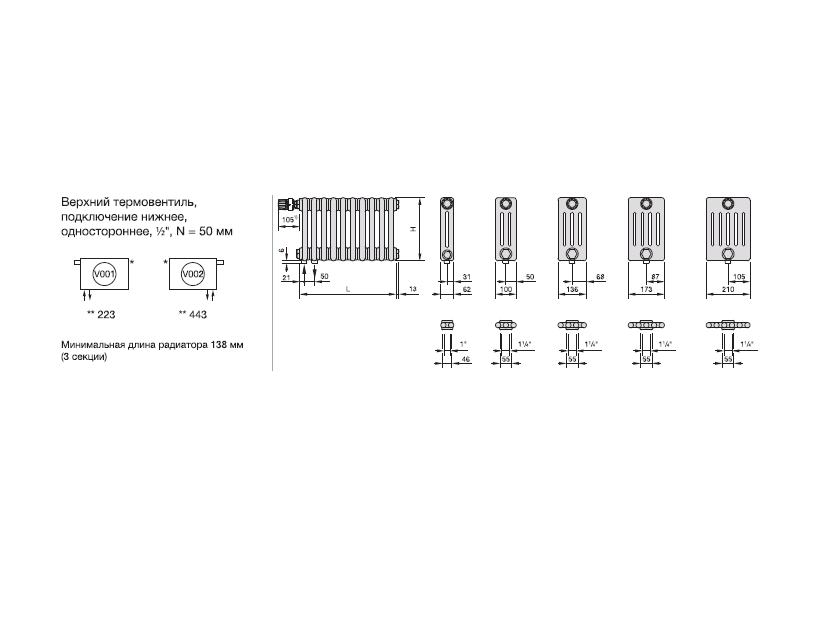 Радиатор трубчатый Zehnder Charleston Retrofit 2056, 18 сек.1/2 ниж.подк. RAL9016 (кроншт.в компл)