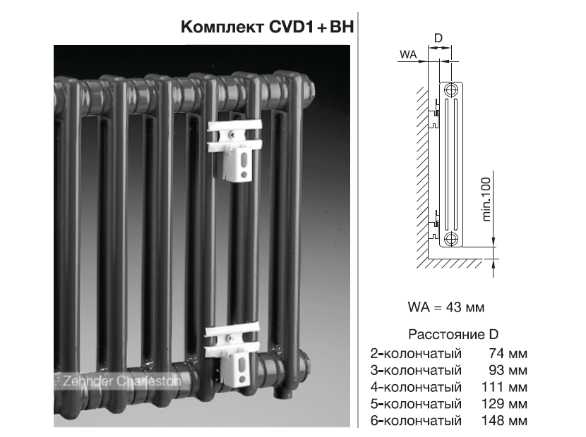 Zehnder Charleston – трубчатый секционный радиатор из стали. Отдельные секции (длина одной секции 46 мм) свариваются в готовый радиатор радиатор грунтуется, покрывается порошковой эмалью цвета RAL и подвергается горячему обжигу в соответствии с DIN 55900. Тепловая мощность проверена в соответствии со стандартом EN 442. Коллекторная часть радиатора выполнена из листовой стали.